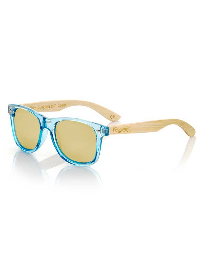 Gafas de sol con patillas de madera, modelo CANDY BLUE DS de Root Sunglasses ® con lentes Polarizadas clase 3 y protección UV400. Herraje de acero con muelle para un ajuste perfecto. Incluye funda de yute ecológica, gamuza limpiadora y prospecto informativo español-inglés. Lentes revo = espejadas.