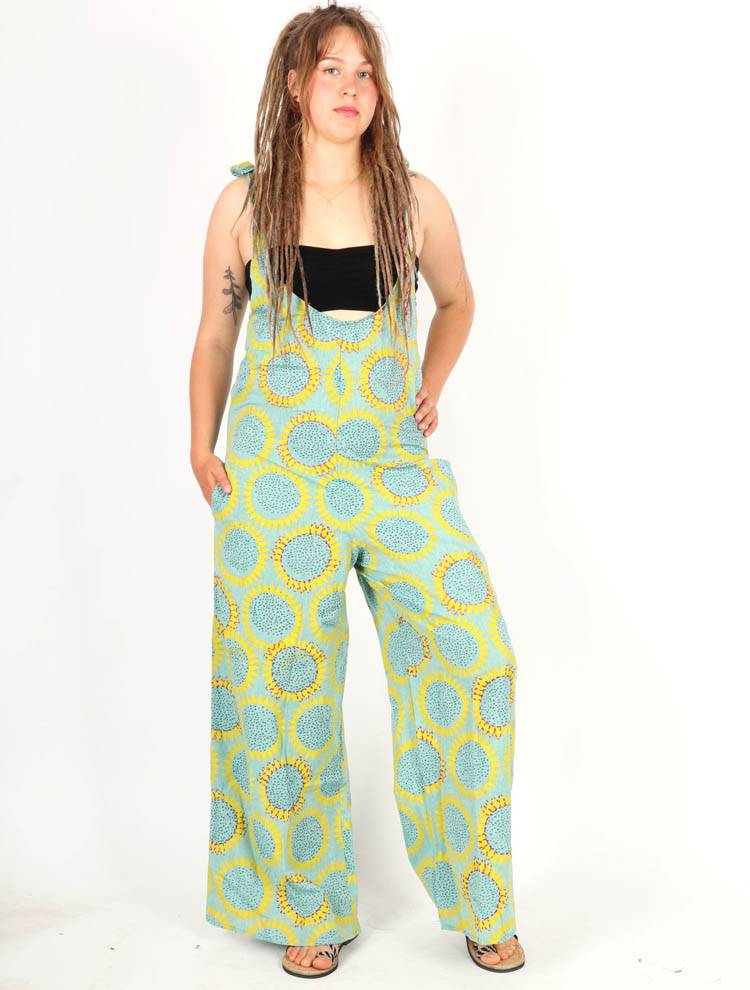 Mono largo confeccionado en tejido ligero con estampado de girasoles en tonos vivos, disponible en diferentes combinaciones de color. Diseño de tirantes ajustables mediante nudo que permite adaptar el largo, con escote amplio y corte recto de pierna ancha para mayor comodidad. Incorpora bolsillos laterales funcionales y una caída fluida que facilita el movimiento. El tejido presenta ligeras irregularidades propias de su acabado artesanal, así como detalles de costura decorativa visibles en algunos motivos del estampado, aportando un carácter único a cada prenda. Ideal para uso diario en climas cálidos gracias a su frescura y ajuste relajado.