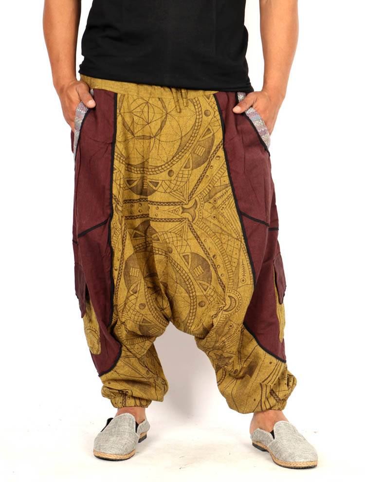 Pantalón harem unisex confeccionado en algodón ligero, con un corte amplio y caída relajada que aporta máxima comodidad. Cuenta con cintura elástica que se adapta fácilmente y bajos ajustados que definen la silueta sin perder fluidez. El diseño combina paneles lisos con un estampado geométrico de inspiración tribal, creando un contraste visual muy característico y original. Incorpora bolsillos laterales funcionales y detalles de costuras visibles que refuerzan su estética artesanal. Una prenda cómoda, versátil y con personalidad, ideal para el día a día o para quienes buscan un estilo diferente. Cada pieza puede presentar ligeras variaciones en el estampado, lo que la hace única.