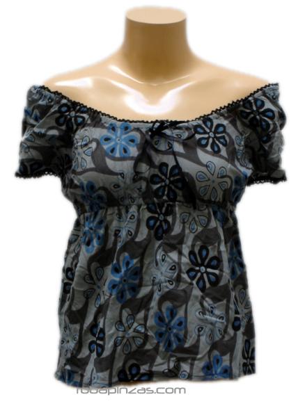 Blusa manga corta, algodón estampado, cuello barco