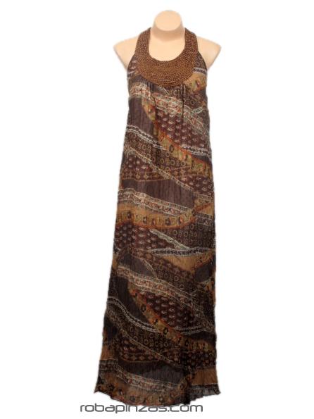 Vestido largo de gasa fina estampada, cuello en cuentas de maderas duras tropicale. Talla única